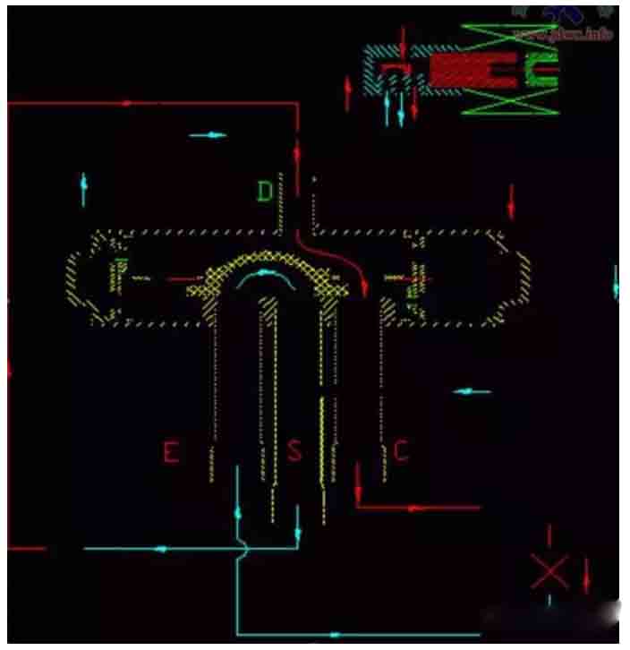 2. 當(dāng)主滑閥運(yùn)動(dòng)到中間位置時(shí),四通閥的E、S、C三條接管相互導(dǎo)通,壓縮機(jī)排出的冷媒從四通閥D接管直接經(jīng)E、C接管流向S接管(壓縮機(jī)回氣口),使壓力差快速降低,形成瞬時(shí)串氣狀態(tài)(中間流量狀態(tài))。