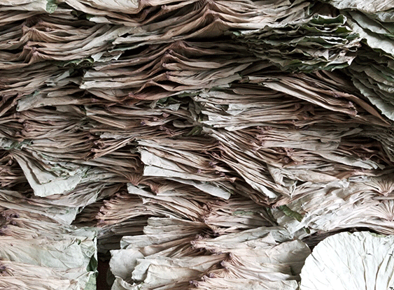 2. 選擇新鮮無痕的荷葉,以葉大、色綠者為佳,除掉葉柄,將荷葉對折成半圓形,分成大中小三類;