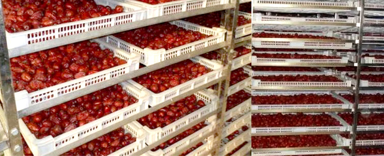 2. 當烘干房溫度升至45-48攝氏度時,棗表面會出現一層小水珠,此時需要提高溫度,在8-12小時內使烘干房溫度升至65攝氏度,切忌超過70攝氏度;