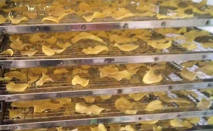 3.經(jīng)過定色后土豆顏色不會再發(fā)生太大的變化,此時需要脫水,將溫度提升至65-70攝氏度之間,濕度控制在55%左右,烘干6-8小時,烘干后的土豆片含水率控制在13%以內(nèi)。