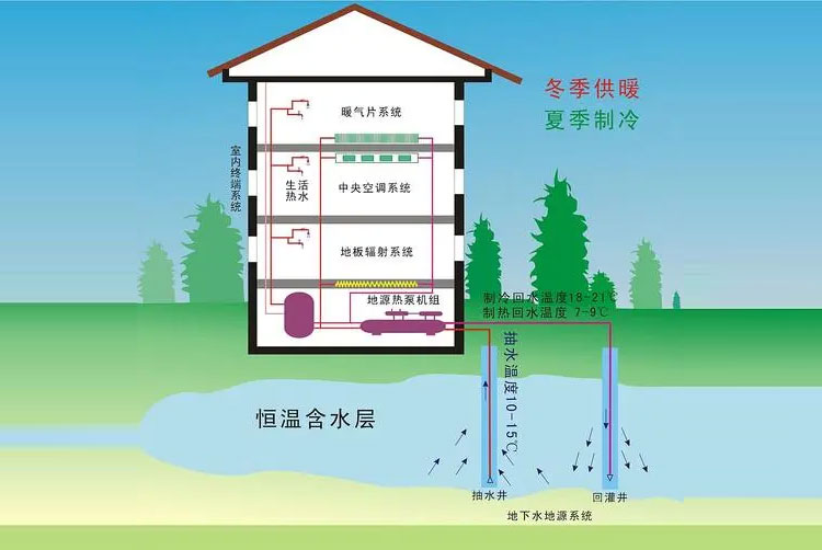 水源熱泵是將地下水、河流和湖泊中吸收的太陽(yáng)能和地?zé)崮芏纬傻牡推肺粺崮苜Y源,通過(guò)少量的高位電能輸入,實(shí)現(xiàn)低位熱能向高位熱能轉(zhuǎn)移的一種技術(shù)。其同樣可一機(jī)多用、同時(shí)實(shí)現(xiàn)制熱與熱冷,且運(yùn)行效率高、運(yùn)行成本低。