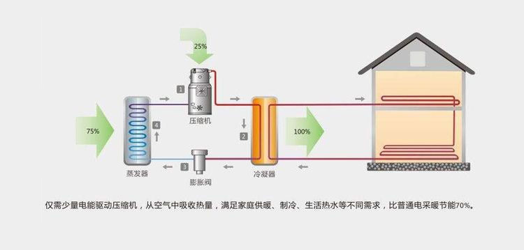 空氣源熱泵是一種利用少量電能驅(qū)動(dòng)壓縮機(jī)做功、通過(guò)冷媒的物理相變并結(jié)合冷凝器及蒸發(fā)器進(jìn)行熱交換、從而將空氣中的熱能轉(zhuǎn)移到其它地方的裝置。它的優(yōu)點(diǎn)是節(jié)能效果顯著,一度電能當(dāng)三度電用,相對(duì)比傳統(tǒng)電熱裝置節(jié)能75%以上,且應(yīng)用范圍廣泛,在-25℃至40℃環(huán)境中均能正常使用,不受陰、雨、雪等惡劣天氣和冬季夜晚的影響,運(yùn)行過(guò)程中不產(chǎn)生任何污染物排放,是一款真正既節(jié)能又環(huán)保的設(shè)備。