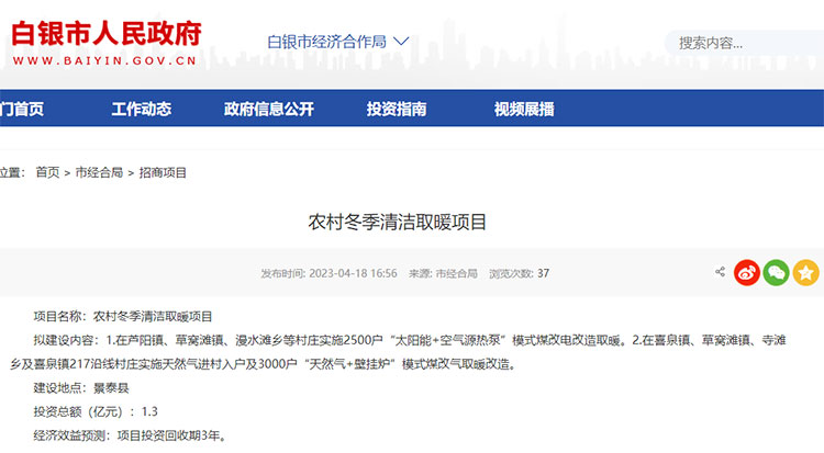 據(jù)悉,今年上半年白銀市下屬景泰縣發(fā)布了一項總投資額達1.3億元的農(nóng)村冬季取暖項目,項目涵蓋蘆陽鎮(zhèn)、草窩灘鎮(zhèn)、漫水灘鄉(xiāng)等村莊實施2500戶“太陽能+空氣源熱泵”模式煤改電改造取暖及喜泉鎮(zhèn)、草窩灘鎮(zhèn)、寺灘鄉(xiāng)及喜泉鎮(zhèn)217沿線村莊實施天然氣進村入戶及3000戶“天然氣+壁掛爐”模式煤改氣取暖改造。